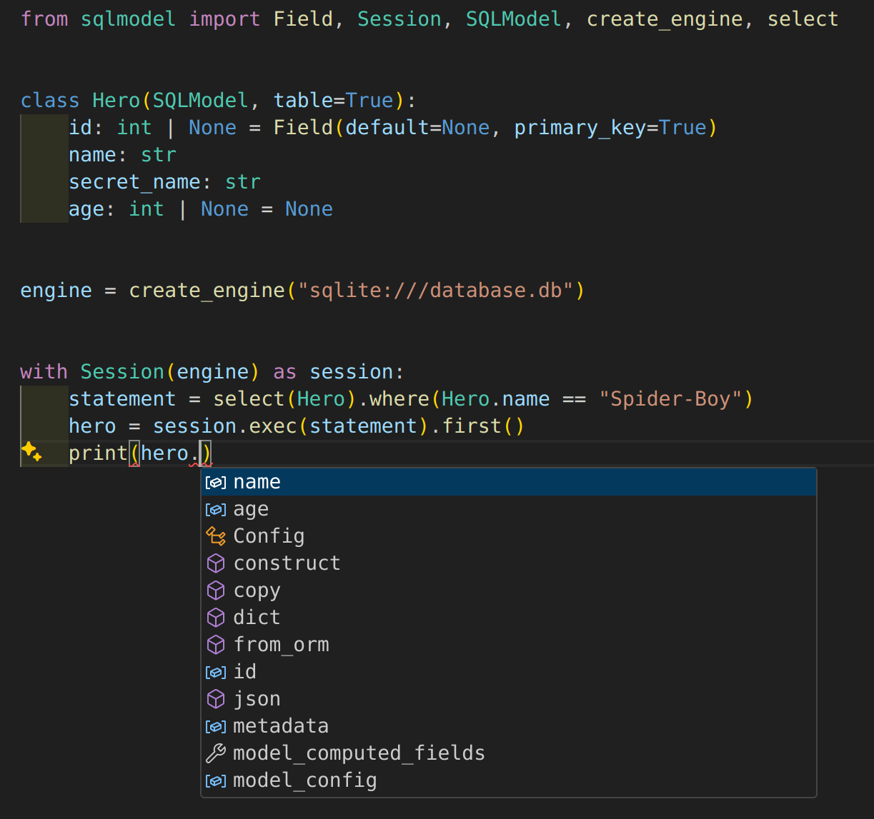 , etc. Your editor will be able to help you with everything because SQLModel is based on standard Python type annotations.